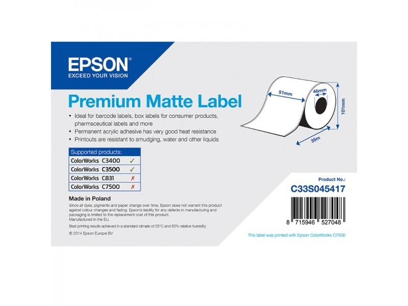 Etikettenrolle C33S045417 – Normalpapier 51mm x 35m, Premium matt beschichtet für Epson ColorWorks C3400 und Epson ColorWorks C3500 + C4000