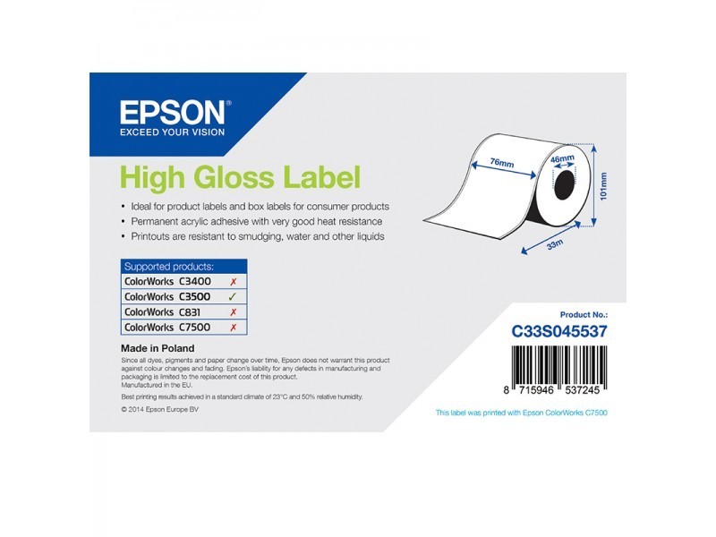 Etikettenrolle C33S045537 – Normalpapier 76mm x 33m, glänzend für Epson ColorWorks C3500 und Epson ColorWorks C4000