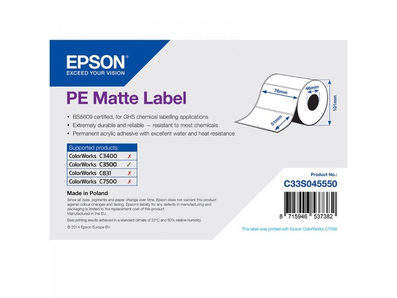 Etikettenrolle C33S045550 – Kunststoff 76 x 51mm – Polyethylen, matt beschichtet für Epson ColorWorks C3500 + C4000